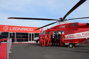 Andrea Piazza and Stefano Mirone with a group of Italian fire department pilots outside the Leonardo helicopter exhibit at the Paris Air Show in June.