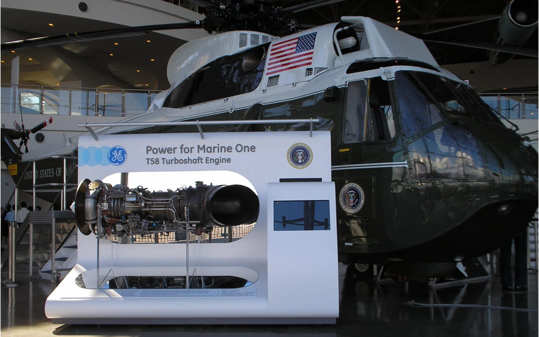 Attendees recently participating in the National Defense Forum at The Ronald Reagan Presidential Library in Simi Valley, California were greeted by a sparkling new Marine One T58 Engine exhibit chronicling six decades of GE power for the Presidential Fleet. The exhibit was developed and donated to the Library by GE for public education.