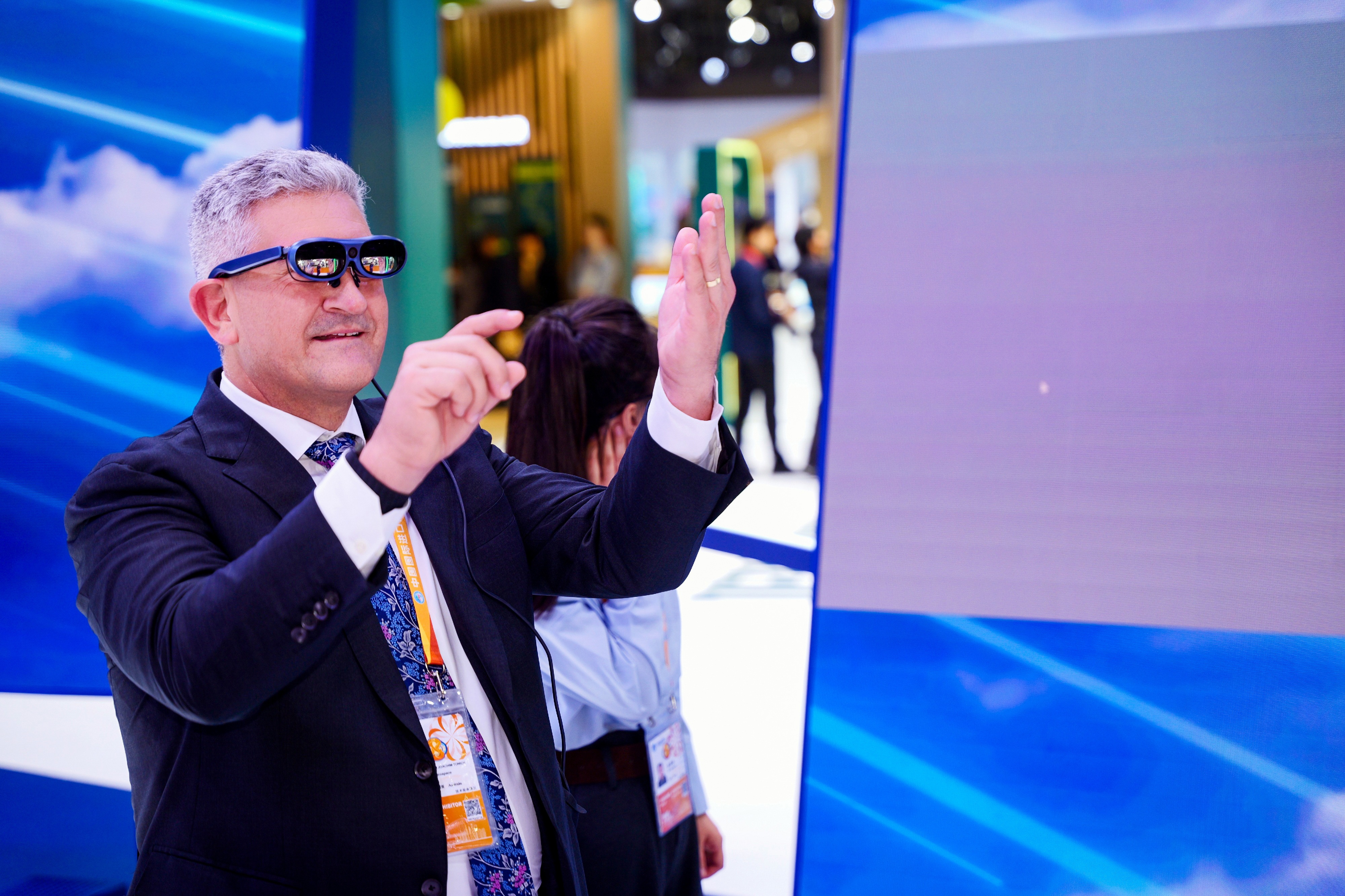 GE航空航天展台的另一首展展品是基于混合现实(MR)技术打造的“可触摸的LEAP发动机”。参观者佩戴MR眼镜后,一台虚拟的发动机便跃然眼前,通过手势操作,可以探索其内部结构,了解其核心工作原理——无论是“拆解”风扇叶片,还是“组装”燃油喷嘴,都能在语音引导下轻松完成。与此同时,旁观者也可通过大屏幕实时看到互动画面,共同感受航空科技的魅力。